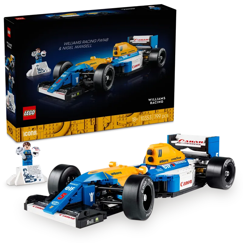 Hail the history of F1 innovation with the LEGO® Icons Williams Racing FW14B & Nigel Mansell (10353) home and office desk decor model building kit for adults. Craft a replica of the legendary F1 race car that propelled Nigel Mansell to victory in the 1992 Formula 1 World Championship. Complete with a Nigel Mansell minifigure, this premium display model makes a captivating centerpiece and a great holiday or birthday gift for fans of F1.