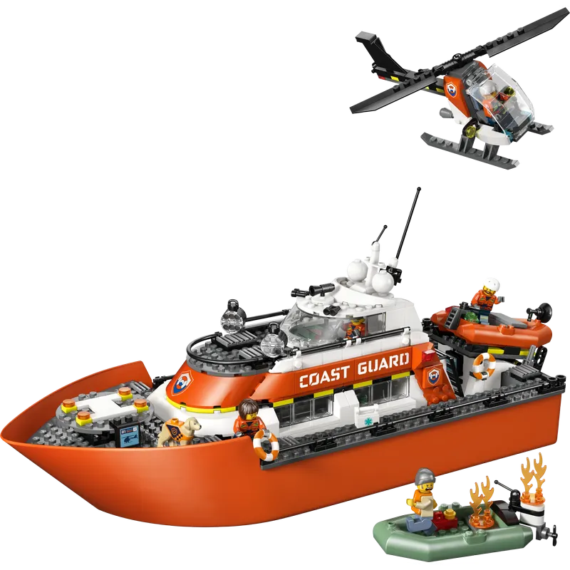Epic adventures await with this LEGO® City set, featuring a floating rescue boat toy, helicopter, 2 floating dinghies, 5 minifigures and a dog figure.