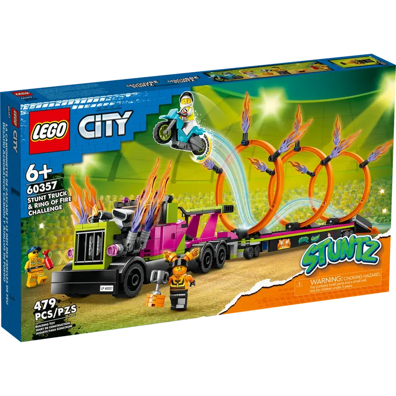 Bring the show to town with the LEGO® City Stunt Truck & Ring of Fire Challenge (60357). This action-toy playset for ages 6+ includes a cool truck with fiery exhaust stacks and a flatbed trailer with a fold-down launch ramp and 3 adjustable rings of fire. Just add the flywheel-powered stunt motorcycle, truck driver and 2 Stuntz rider minifigures for hours of action-packed play.