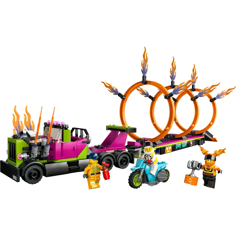 Exciting stunt action awaits with this LEGO® City Stuntz playset, including a cool truck, triple ring of fire challenge, stunt bike and 3 minifigures.