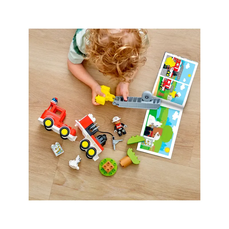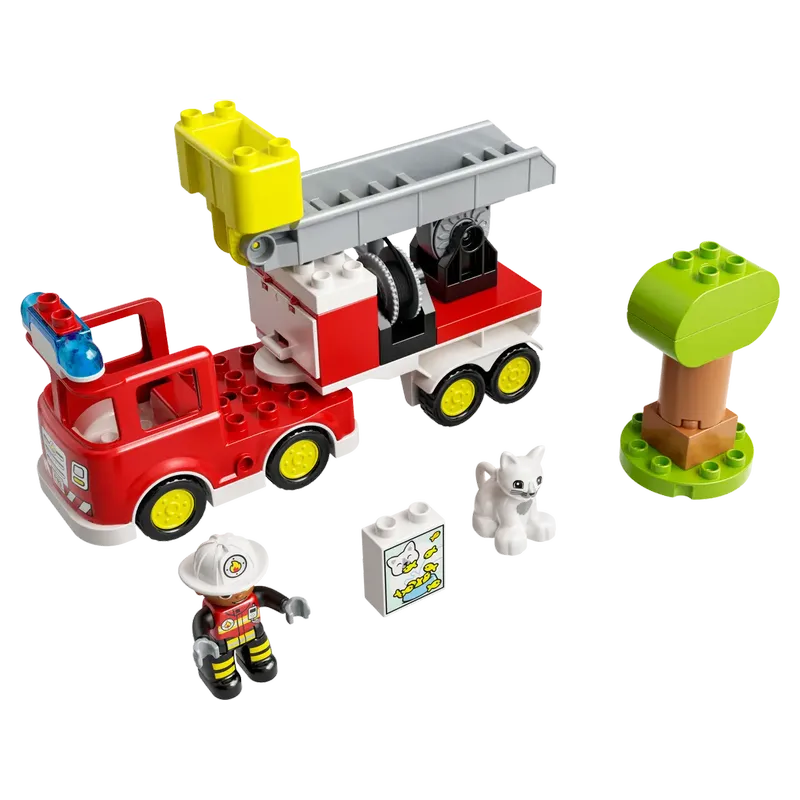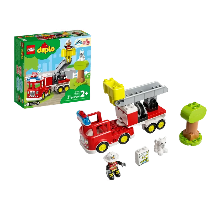 LEGO® DUPLO Rescue Fire Truck (10969) is a 21-piece set for toddlers (ages 2+) featuring a fire truck with flashing lights and a siren (batteries included) for rescuing a cat stuck in a buildable tree, with included firefighter and cat figures, plus treats and a detachable hose for imaginative play, boosting motor skills and emotional development through realistic, hands-on rescue missions.