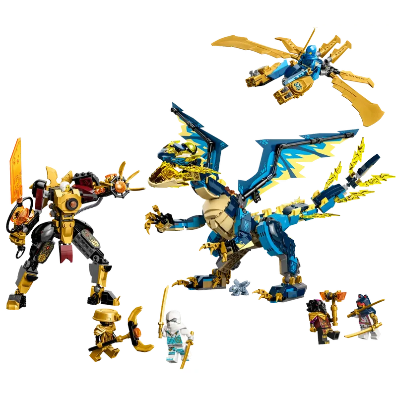 Ninja fans aged 9+ can recreate an epic showdown from the NINJAGO® Dragons Rising TV series with Elemental Dragon vs. The Empress Mech (71796). The building set features fearsome dragon Jiro, who can be upgraded by adding golden blade wings and stud shooters from a flyer vehicle to take on the Empress’s posable golden mech, who is wielding a large sword.