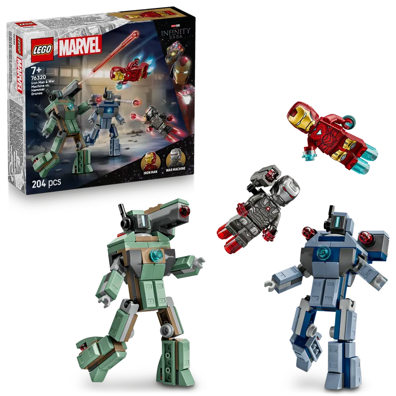 Эта сборная игрушка воссоздает эпическую сцену сражения из фильма Marvel Studios «Железный человек 2». В наборе есть минифигурки Железного человека и Воителя, а также два сборных Хаммер-дрона. Хаммер-дроны полностью подвижные, поэтому дети могут придавать им желаемые позы для реалистичной и динамичной игры. У зеленого Хаммер-дрона пружинный шутер на плече. У синего Хаммер-дрона на каждом плече по нажимному шутеру. У Воителя красные бластеры на руках и ногах, а на плече шипомет. У Железного человека синие бластеры на руках и ногах, а также он может стрелять лучом из лазера. Чтобы собирать было еще интереснее, строители могут увеличивать, поворачивать модели в 3D и отслеживать свой прогресс в интуитивно понятном приложении LEGO Builder. В наборе 204 детали.