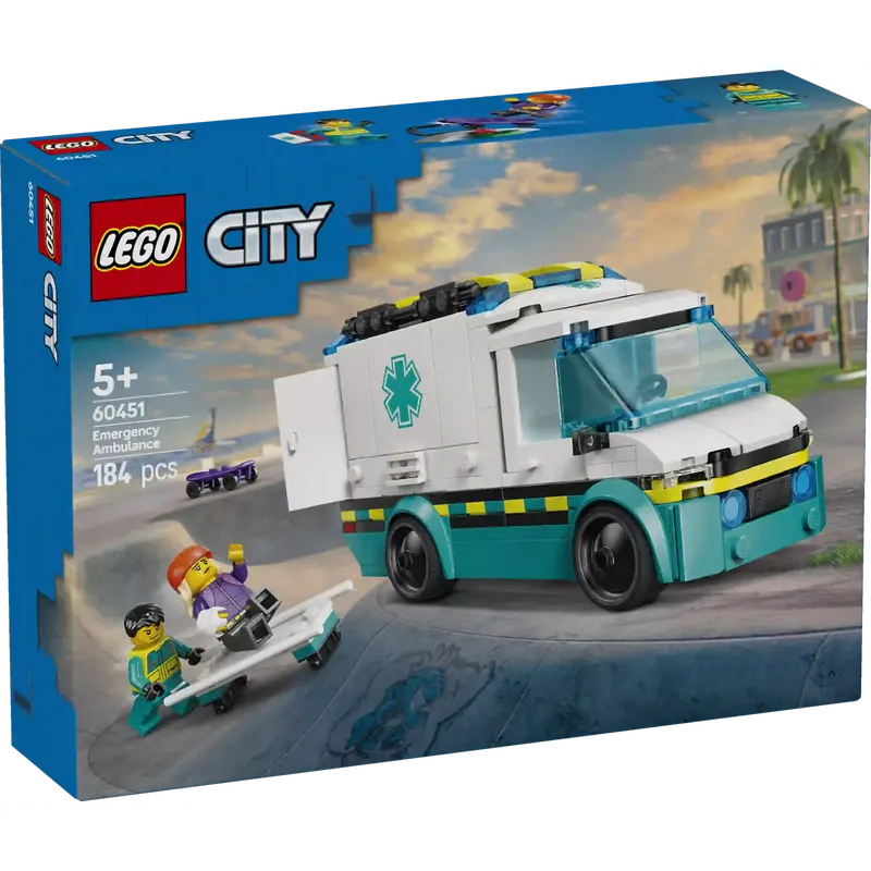 Action-packed rescue missions await with this LEGO City Emergency Ambulance toy (60451) for ages 5 and up. Kids can fold up the side panels and open the rear doors for easy access to the onboard stretcher and medical equipment, including a toy syringe, bandage and medic bag. The set also includes a skateboard and skate ramp setting, plus skateboarder and paramedic minifigures for fun role play and storytelling.