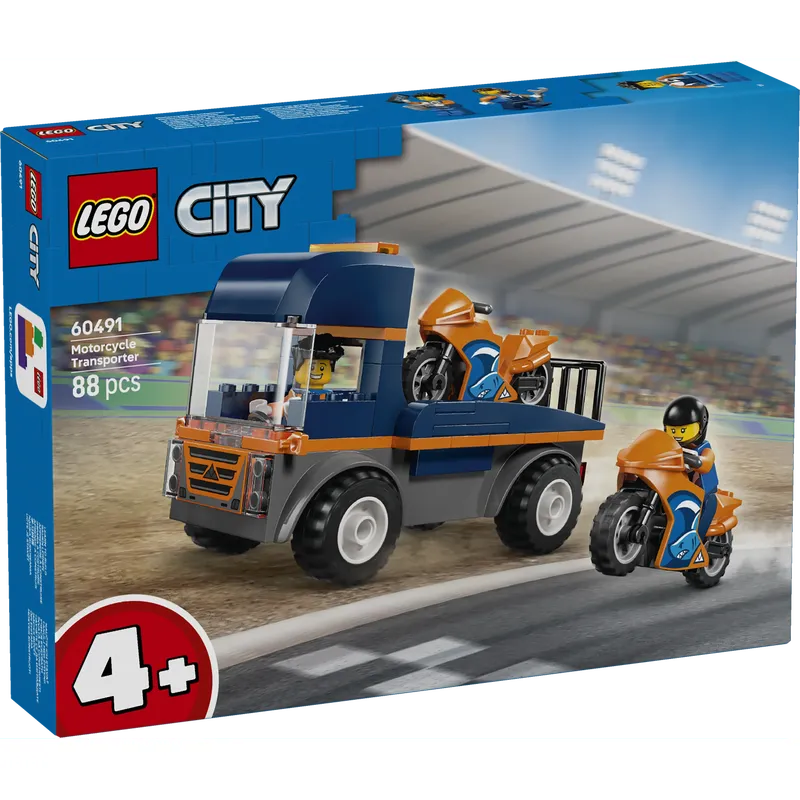 Порадуйте юного поклонника автогонок этим простым в сборке набором LEGO® City «Мотоциклетный транспортер», в который входят игрушечный грузовик с платформой, 2 игрушечных мотоцикла и 2 минифигурки.