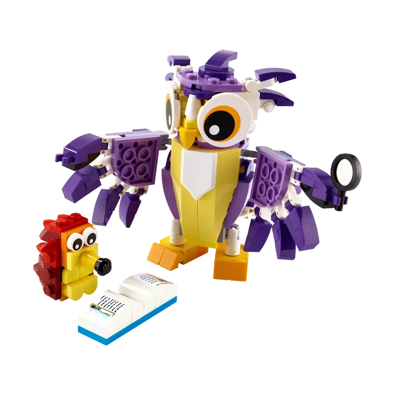 Дети в возрасте от 7 лет могут разыгрывать волшебные истории о лесных обитателях с этим милым набором для сборки «Удивительные лесные обитатели» LEGO® Creator 3 в 1 (31125). В нем есть мудрая сова с крутящейся головой и подвижными хвостом, лапами, крыльями и перьями, читающая ёжику книгу сказок.