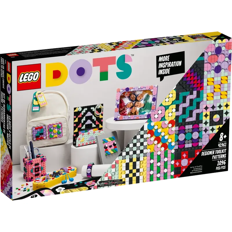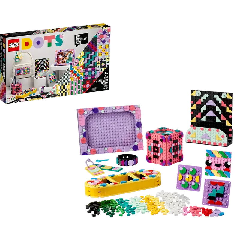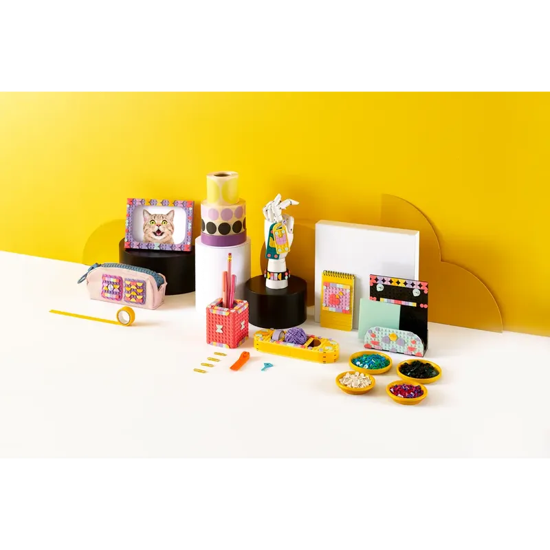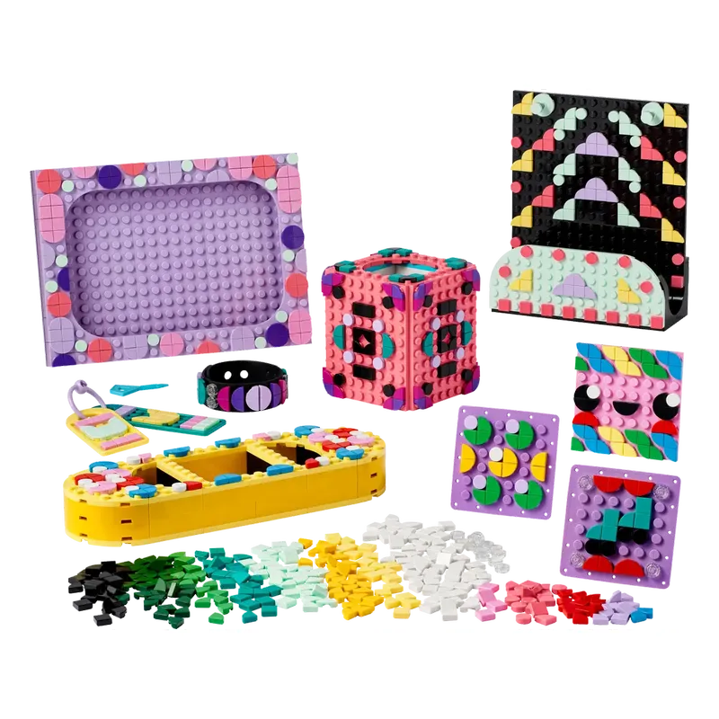 Хотите получить роскошный набор для искусства и творчества для детей в возрасте от 8 лет? Сделайте ребенку или увлеченному любителю творчества великолепный подарок — этот набор дизайнера LEGO® DOTS (41961)! В набор входят десять различных пластин DOTS, включая браслет с двумя рядами, пластину-нашивку и пластину-наклейку, две бирки с посланиями, подставку для карандашей, настольный ящичек, лоток для заметок и большую фоторамку, а также более 860 плиток пяти различных стилей и оттенков для оформления. Дети могут собирать и создавать бесконечные узоры на предметах, чтобы выразить себя так, как им нравится.
