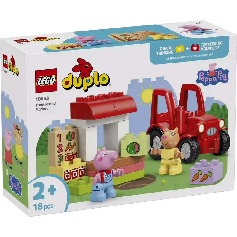 Help toddlers cultivate their creativity with the Peppa Pig Tractor and Market (10468) building toy. Toddlers ages 2 years old and up immerse themselves in imaginative play as they imitate running a farm store and stocking it with the LEGO DUPLO® bricks decorated with food items to sell. This pretend play toy comes with Pedro Pony and Peppa Pig figures, a drivable red tractor and carrot, watermelon and jam jar bricks.