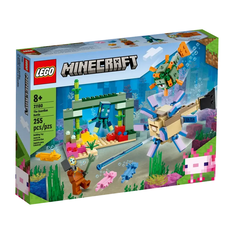 «Битва со стражем» LEGO® Minecraft® (21180) отправляет игроков в возрасте от 8 лет в подводное приключение, где их ждет множество знакомых персонажей и функций из хитовой игры.